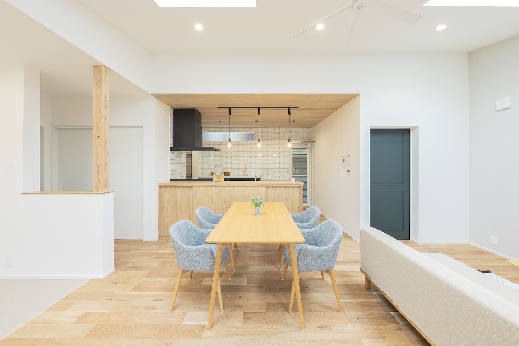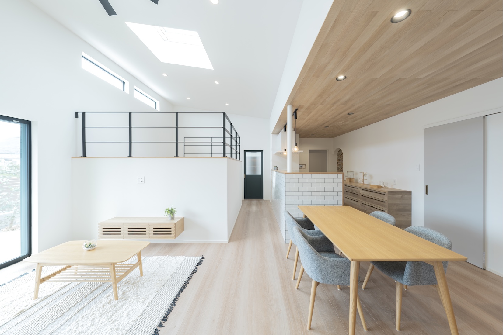 室内は白を基調とした明るい空間に、無垢材の床や天井、